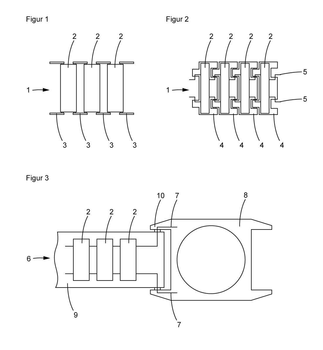 In addition, the figure 2 shows an accumulator as a link band (1) with accumulator cells (2), which are integrated in the band links (4) connected together and connected with each other by electric wires (5).