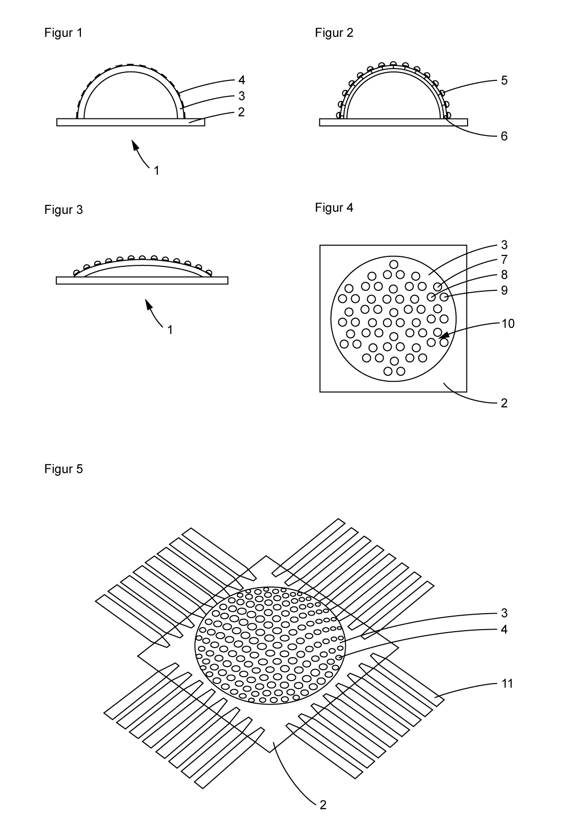 The figure 3 simply shows a flatter variant of a Directional Light-Emitter (1) with nanolenses/-lenslets (5) to make clear that the shape must not be a hemisphere.