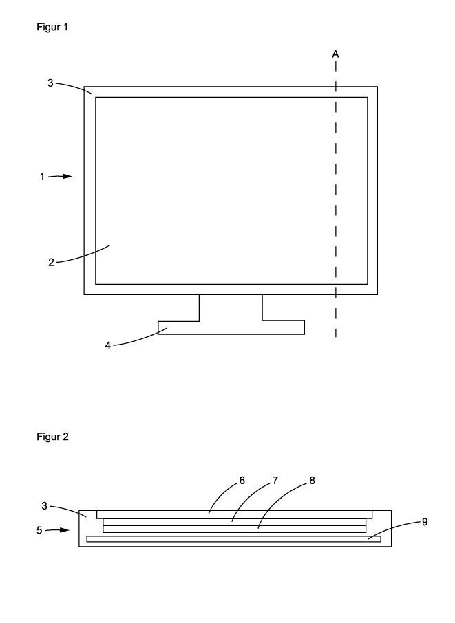 The figure 2 shows the cut (A) through the mobile computer system (4) with case (3), protective glass of the layered/stacked display (5), transparent active Liquid Crystal (LC) display (6), reflective (Active) Interferometric MOdulator Display ((A)IMOD) (7), system board with processor, data storage and other components (8) and the energy source/power supply (9).