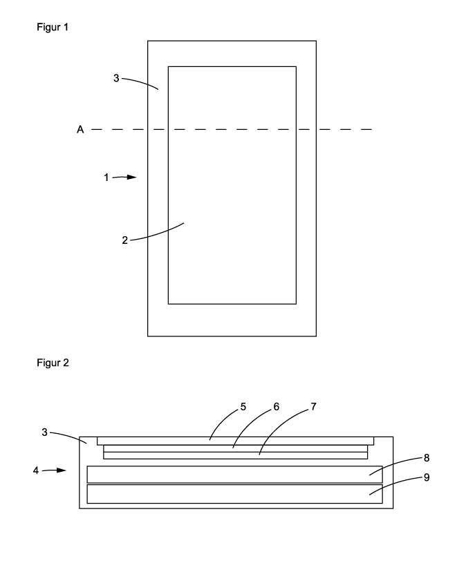 The figure 2 shows the cut (A) through the electronic, visual (5) with case (3), protective glass of the layered/stacked display (6), active display (7), reflective display (8), system board with control electronics (9).