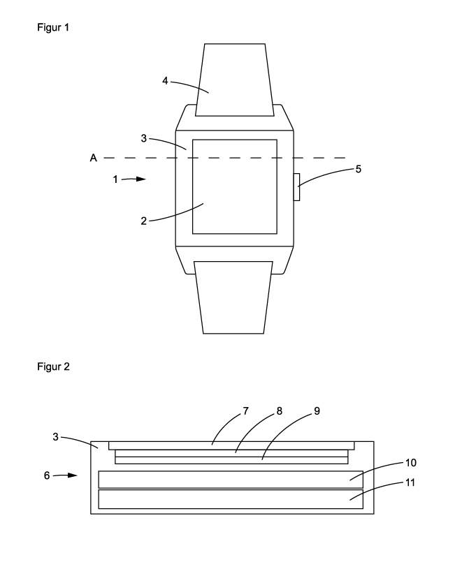 The figure 1 shows a mobile computer system (1) with layered/ stacked display (2), case (3), wristband (4) and operating button (5) as top view.
