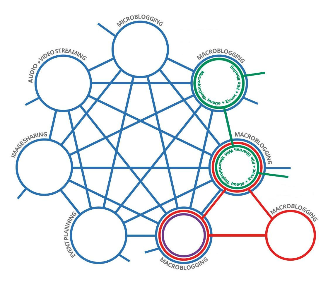 The graphic below shows the old interconnections of the common Ontoverse (Ov) Social and Societal System (SoSoS or S³) platforms with underlying social networking protocols (color shows communications and functions) for federated Ontologic Applications and Ontologic Services (OAOS), including