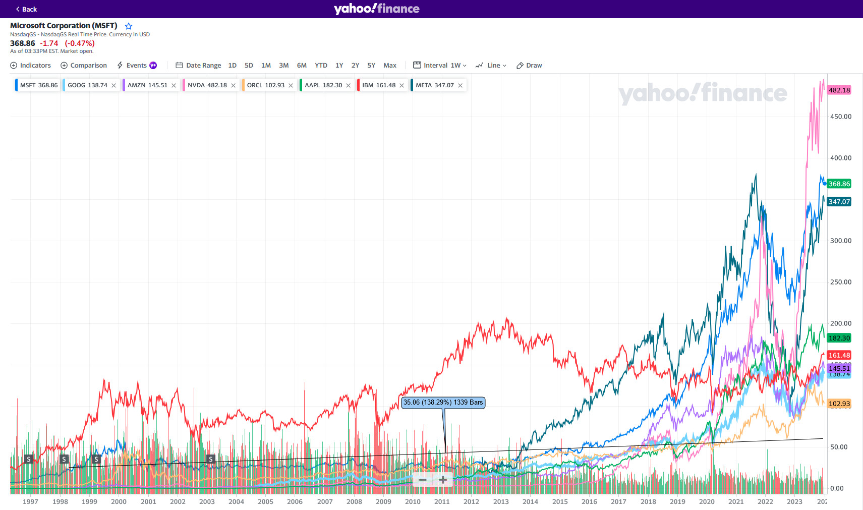 The chart (updated on the 4th of January 2024) below shows a comparison of the performance of the shares of the companies Microsoft, Alphabet (Google), Amazon, Nvidia, Oracle, Apple, IBM, and Meta (Facebook) in linear mode.